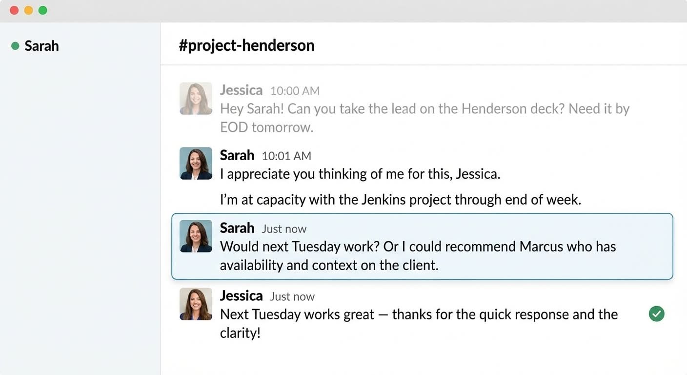 But if you're in a role where being responsive and collaborative is genuinely part of your value proposition, a flat "no" doesn't always serve you.
