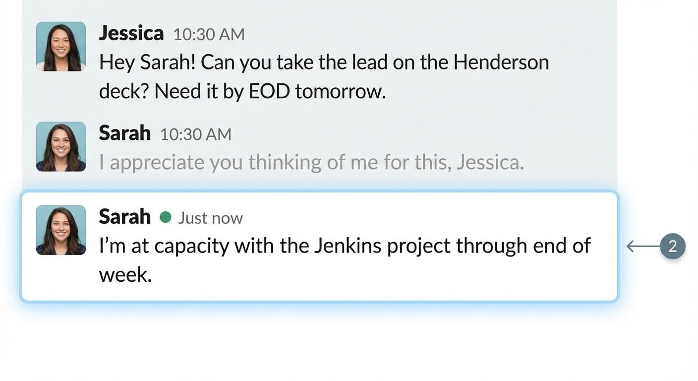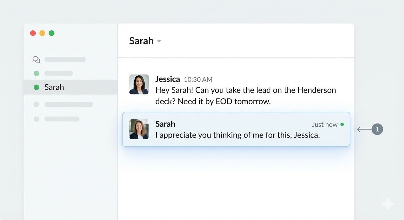 She opened Slack. Typed three sentences. Hit send.
