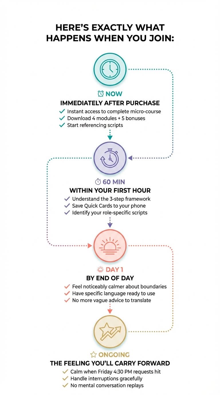The scripts use what we call "bridge language"—phrases that protect your boundary while keeping the relationship intact. You'll sound professional, thoughtful, and confident—never harsh or difficult